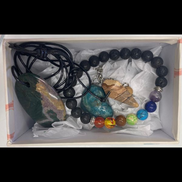 Gift Pack- Chakra Braclet, Blue Apatite Stone, Green Jasper Pendulum & Landscape Jasper Necklace